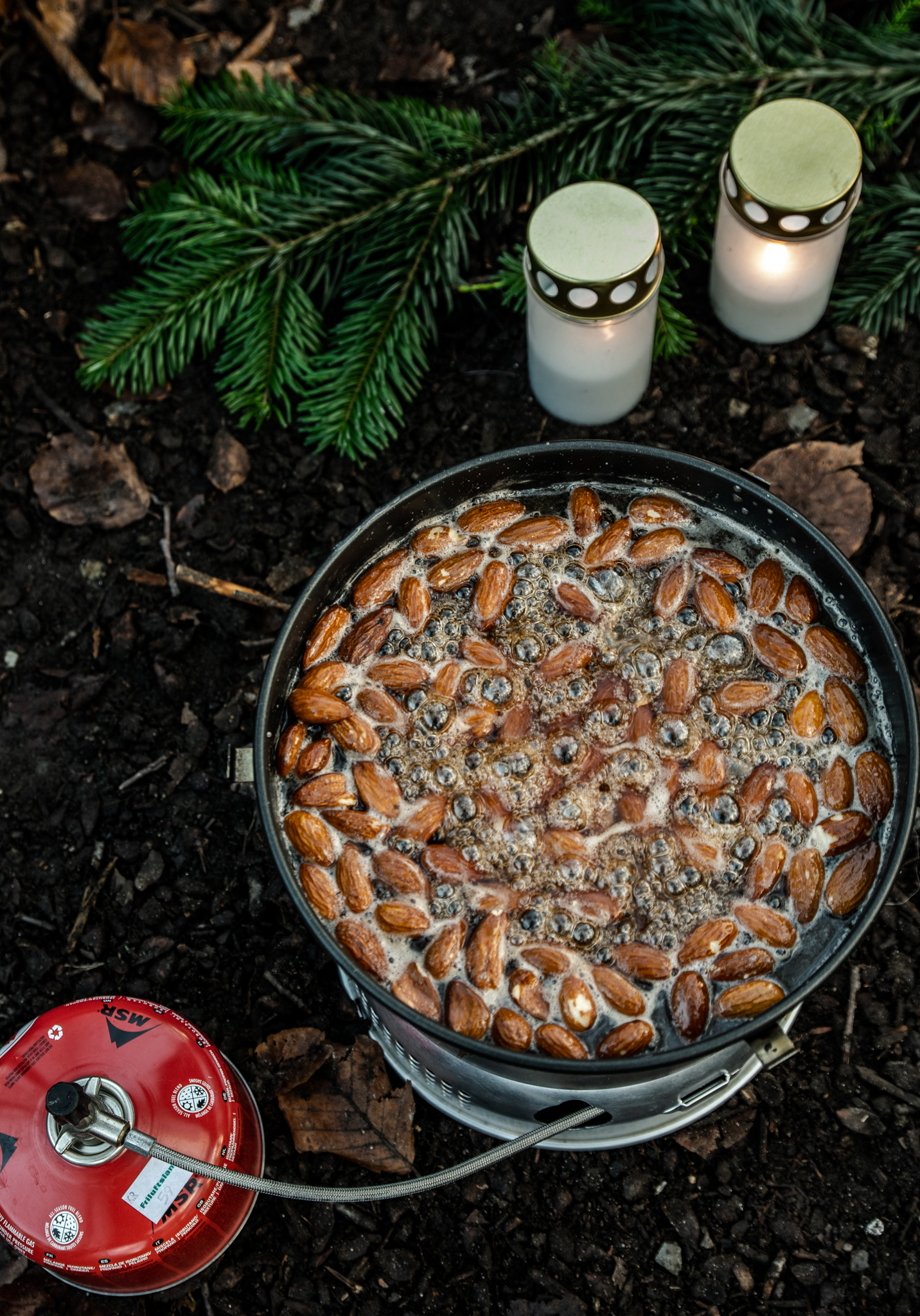 En god og nem udendørs juleaktivitet er at lave brændte mandler på brænder eller over bål. Det kræver nemlig kun 3 ingredienser: mandler, sukker og vand, som snildt kan medbringes i haven eller skoven. Vi har brugt en Trangia (men med bål ved siden af til at lune sig omkring), som fungerer rigtig fint til formålet. Har du båludstyr, kan de brændte mandler også snildt laves over flammerne på en støbejernspande.