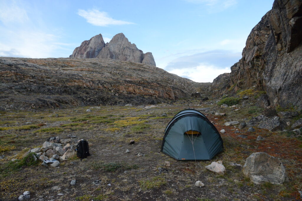 I august og begyndelsen af september er der typisk stabilt godt vejr i Grønland. Man skal dog altid være forberedt på kraftig vind, regn, slud eller sne. Derfor skal man medbringe et godt, stabilt telt med så tilstrækkelig stor apsis, at det er muligt at tilberede maden inde i teltet. Vi medbragte et Hilleberg Keron 3, der er en ren polarvilla. Fordi nætterne er kolde, er gode soveposer og gode liggeunderlag også en nødvendighed. Det fungerede godt for os med dun-sommersoveposer fra Western Mountaineering, suppleret med langt uldent undertøj i de kolde nætter, hvor det var under frysepunktet.
