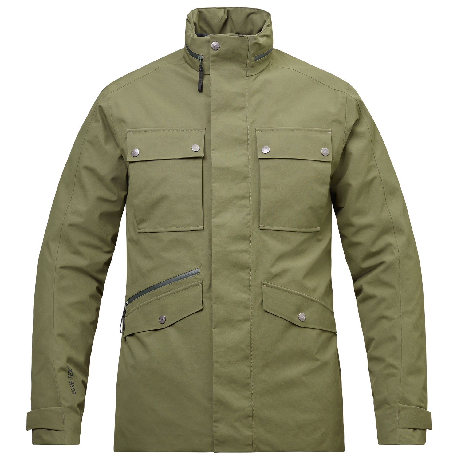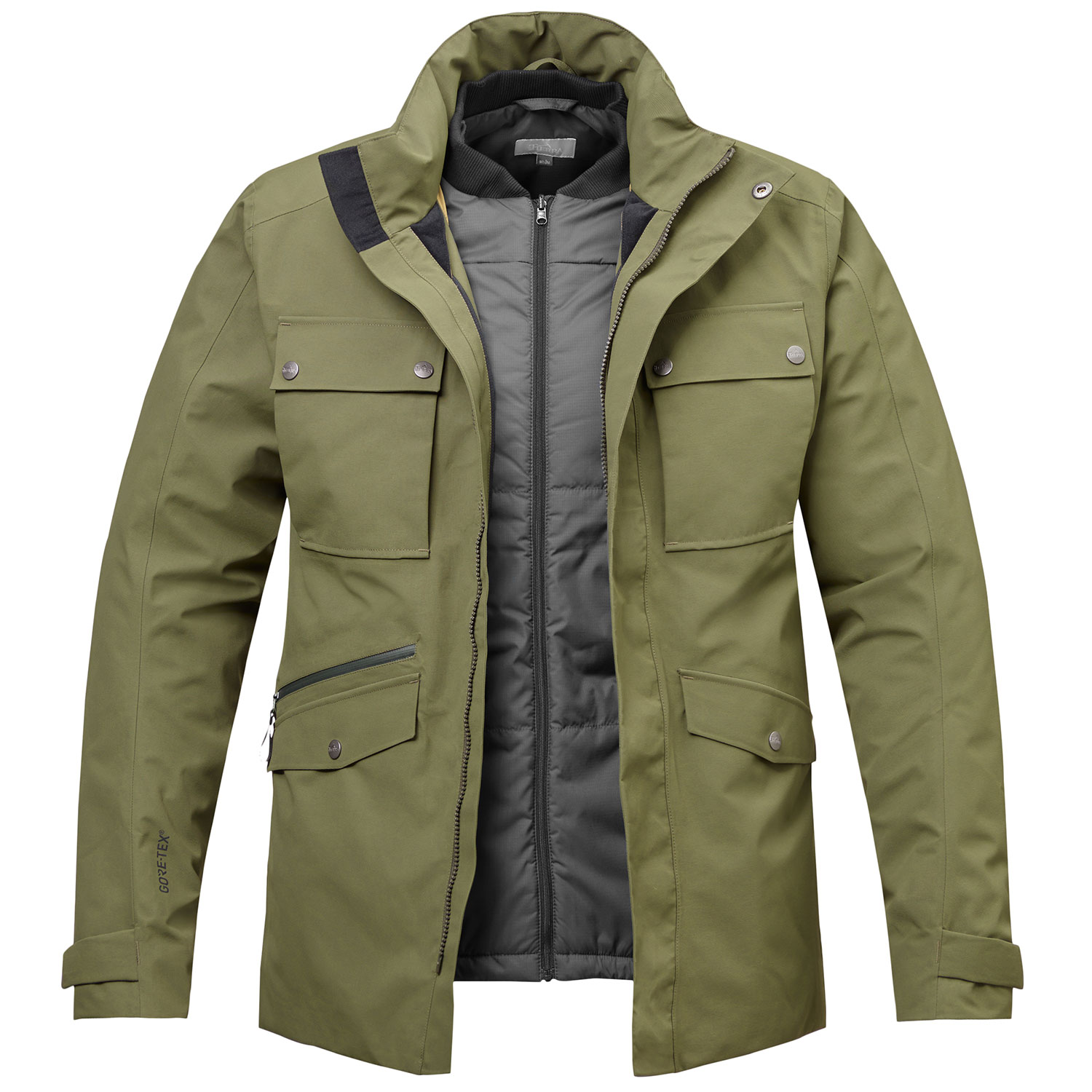 Yderjakken er en vandtæt og åndbar GORE-TEX-jakke. Det kraftige ydermateriale er robust og har en flot tekstur, mens en løsthængende liner på indersiden giver god komfort, direkte mod huden, hvis man bruger yderjakken som regnjakke ud over en kortærmet trøje eller skjorte. Yderjakken er som sagt fuldstændig vind- og vandtæt og ånder ganske glimrende, hvilket gør den velegnet som vind- og vejrbeskyttelse hele året – måske lige med undtagelse af de varme perioder i løbet af sommeren. Damejakken er klassisk frakkelængde med indsnøring i taljen, og dækker godt ned over låret, mens herrejakken er lidt kortere og har indsnøring ved hoften. Damejakken er udstyret med en rummelig hætte, mens herremodellen har en let, kompakt hætte i GORE-TEX Paclite, der kan lynes væk i kraven, når den ikke er i brug. Begge modeller har 2-vejs-frontlynlås, så man kan lyne op og ventilere både oppefra og nedefra, samt velcrojustering ved ærmeafslutningerne, så man enten kan lukke til og holde kulden ude, eller åbne op og få lidt mere luft ind.